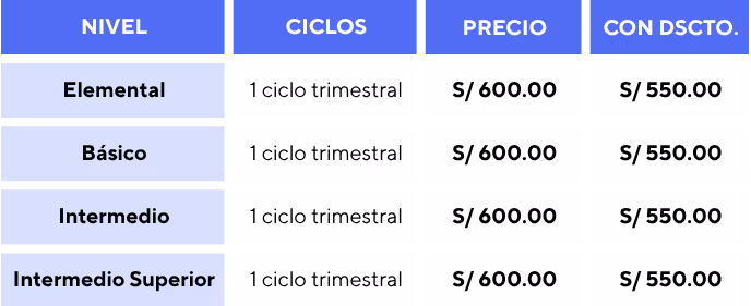 El curso consta de 4 niveles de un ciclo trimestral cada uno: