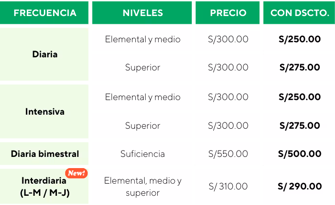 Según la frecuencia elegida, tienes hasta 4 niveles: elemental, medio, superior y suficiencia en portugués integrado.
