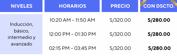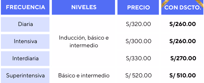 Según la frecuencia elegida, tienes hasta 5 niveles: (1) Inducción, (2) básico, (3) intermedio, (4) avanzado y (5) proficiency.